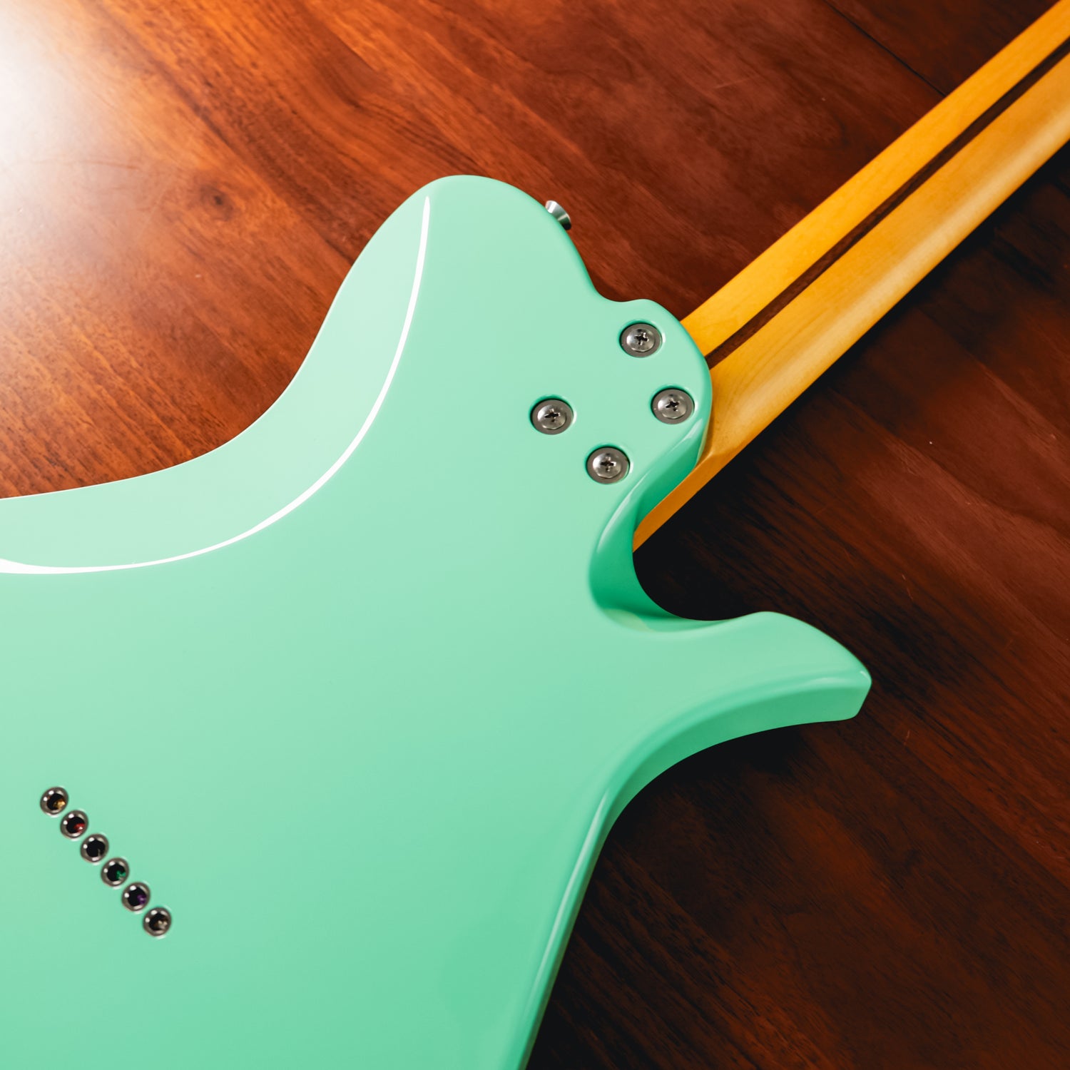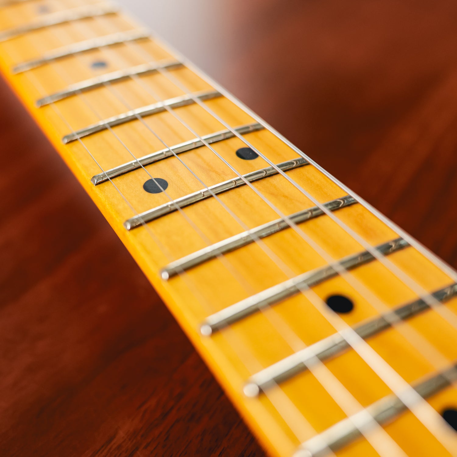 22 nickel frets with give you a classic feel and tone on your neck. Allowing free movement across the fretboard while maintaining that timeless quality. Black dot markers adorn the maple fretboard.