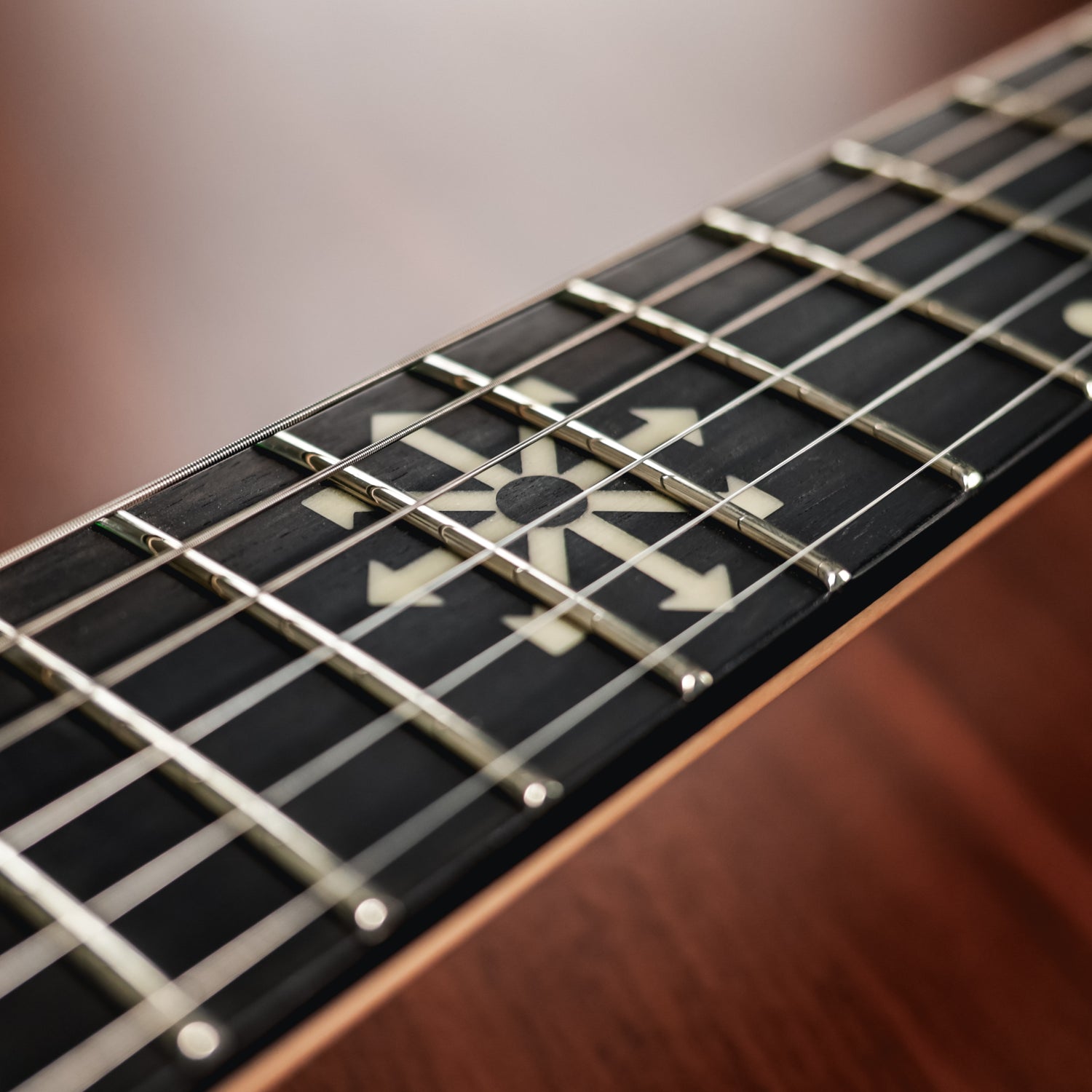The entirety of the ebony fingerboard is adorned with one-of-a-kind Luminlay Green Vola Eye of Life inlays. This illuminating innovation provides visibility in any lighting setting. To add to the allure, a custom “Chaos Star” inlay is perfectly placed at the 12th fret.