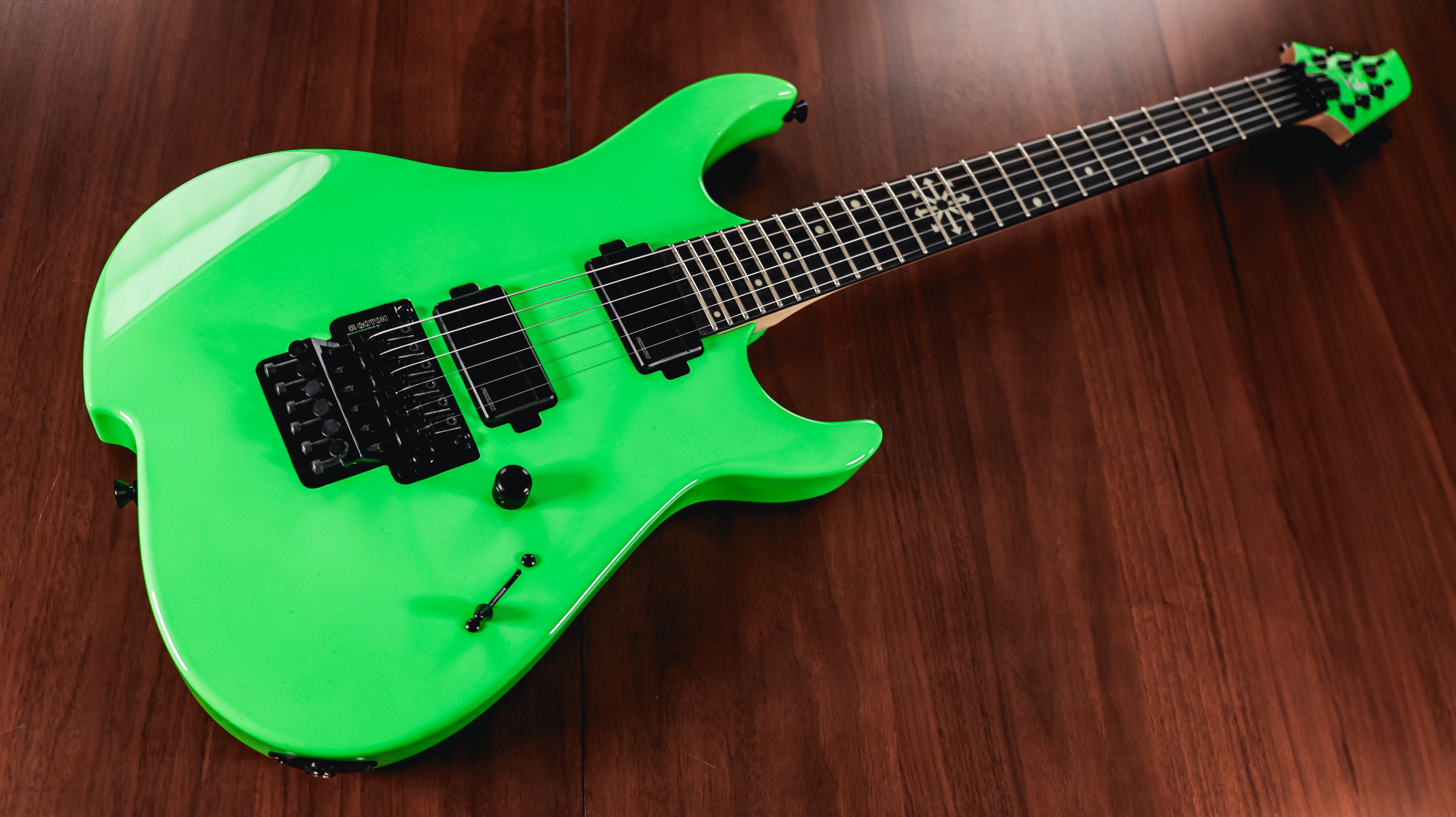 Designed in collaboration with metal titan Michael Keene of The Faceless, this powerhouse of a guitar has appropriately been dubbed “The Keene Machine”. With a sleek demeanor and crushing authority, it was created for uninhibited speed and grit. Perhaps its most notable feature is the integration of a GOTOH 1996T tremolo system, allowing you to raise or lower the pitch with intensity and accuracy. Another key feature is the installation of two Fishman Fluence pickups, which are complemented by a push/pull pot that allows two unique voices between the Fluences and can be expanded upon with the 5-way super switch. Aesthetically, the Alder body is finished with with a custom Keene Green Gloss. The ebony fingerboard is crafted with Vola Eye of Life inlays as well as a signature “Chaos Star” inlay on the 12th fret. If you are searching for a guitar that pushes the envelope in every capacity, look no further.